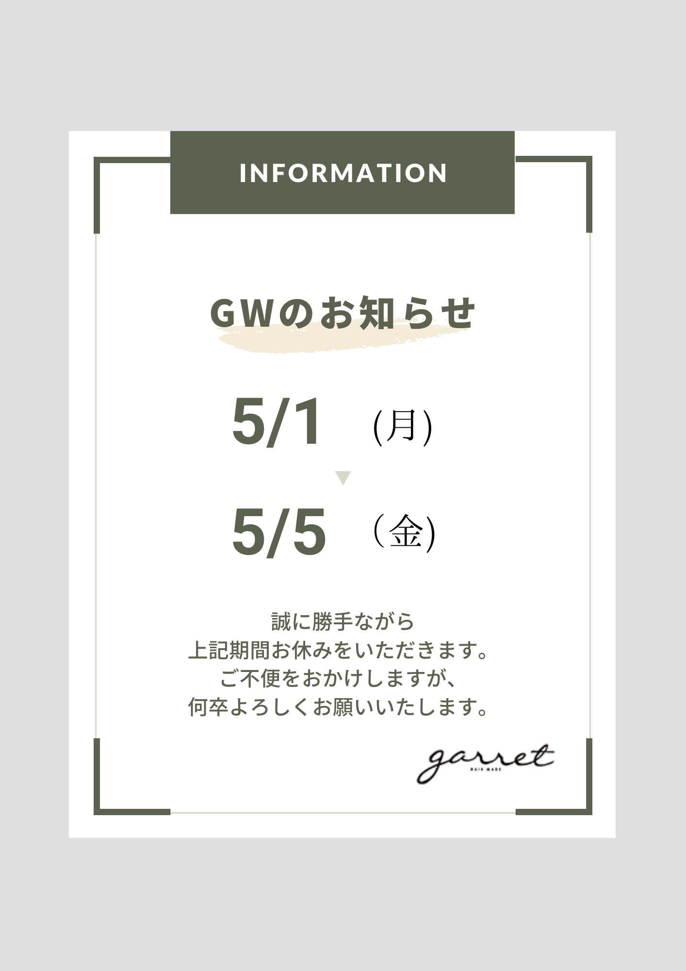 いつもギャレットヘアメイクをご愛顧いただき誠にありがとうございます。 ゴールデンウィークの予定など、計画中の方もいらっしゃるかと思いますが、ギャレットヘアメイクでも下記日程でお休みを頂きます。 5月1日(月)~ […]
